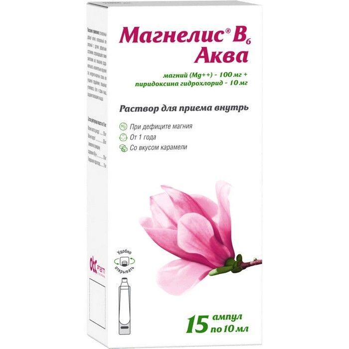 - Препарат Магнелис® В6 Аква представляет собой лекарственное средство в форме раствора для приема внутрь и является комбинацией витамина В6 с минеральными веществами. Препарат содержит действующие вещества: магния лактата дигидрат, магния пидолат, пиридоксина гидрохлорид (витамин В6).