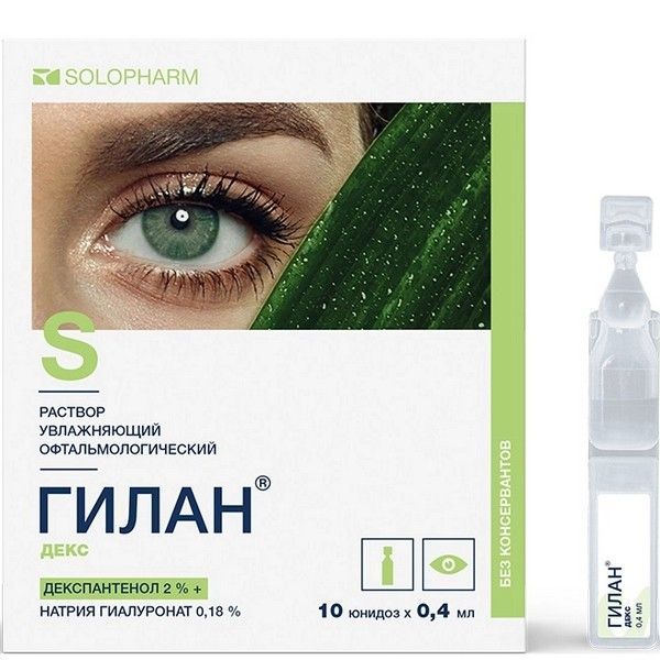 - Раствор увлажняющий офтальмологический Гилан® Декс воспроизводит действие естественной слезы, защищает и увлажняет поверхность глаза и смазывает ее. Это средство оказывает долговременное облегчающее действие при сухости глаз, обусловленной различными факторами: