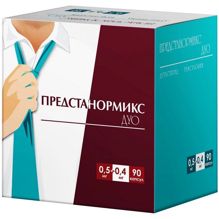 - Препарат Предстанормикс дуо содержит два действующих вещества: дутастерид и тамсулозин. Дутастерид относится к группе веществ, называемых ингибиторами 5-альфа-редуктазы (препараты, помогающие облегчить симптомы нижних мочевых симптомов), а тамсулозин относится к группе веществ, известных как альфа-блокаторы (препараты, способные расширять сосуды, снижать их тонус и нормализовать движение крови по артериям).