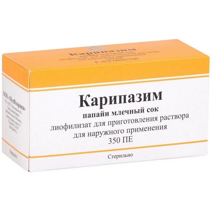 - Карипазим изготавливают из Прокарипазима экстракта сухого, получаемого из Папайи млечного сока высушенного.