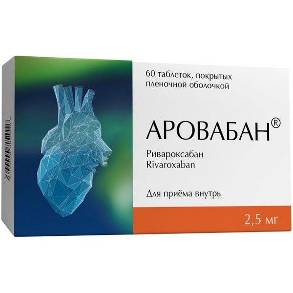 - Внутрь. Принимайте по 1 таблетке препарата Аровабан® 2,5 мг два раза в день, примерно в одно и то же время (например, одну таблетку утром и одну таблетку вечером). Таблетку можно принимать вне зависимости от приема пищи.