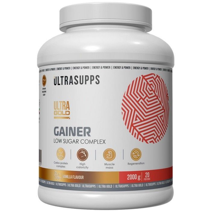 - Биологически активная добавка Ultra Gold Gainer от бренда ULTRASUPPS - это 10 г протеина и 88 г углеводов в одной порции напитка, сбалансированный белково-углеводный комплекс для быстрого наращивания мышечной массы, отличного самочувствия во время и после интенсивных тренировок. Напиток разработан как полноценный продукт питания с идеальным для спортсменов КБЖУ. Высококалорийный гейнер поможет вам сформировать и поддерживать необходимый для роста мышечной массы рацион питания. В одной порции содержатся 10 г быстроусваиваемого концентрата сывороточного протеина и 88 г уникальной смеси сложных углеводов с низким содержанием сахара и оптимальное количество необходимых организму жиров.