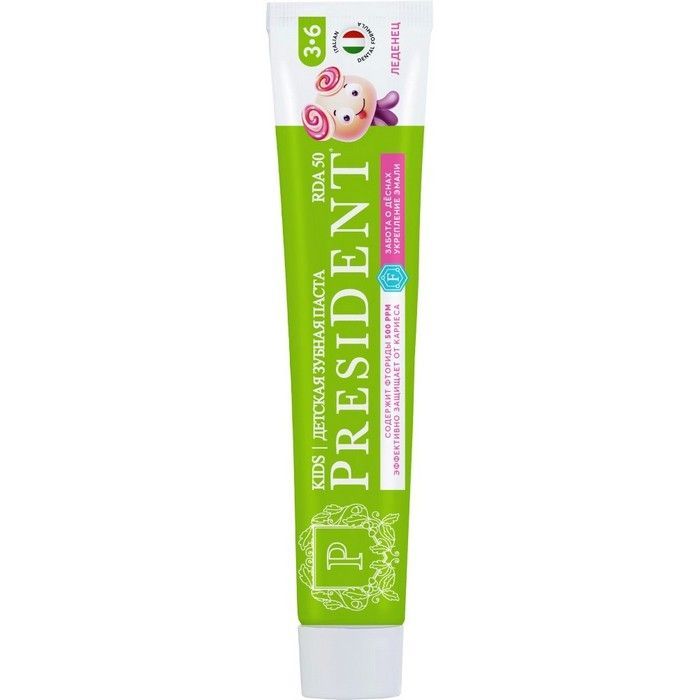 - Детская зубная паста PRESIDENT® Леденец от 3 до 6 лет обеспечивает защиту от кариеса, заботу о деснах, укрепление эмали и эффективное очищение.