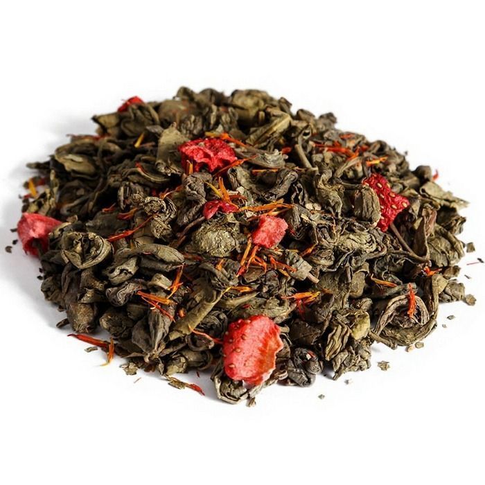Зеленый чай крупнолистовой Ганпаудер с клубнично-сливочным ароматом с добавлением кусочков ягод и рубленого листа клубники, лепестков изысканного сафлора.