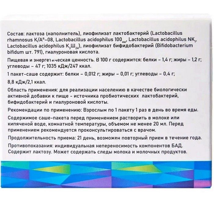 - в качестве биологически активной добавки к пище – источника пробиотических микроорганизмов: лактобактерий (Lactobacillus rhamnosus К/АR-08, Lactobacillus acidophilus 100аш, Lactobacillus acidophilus NK1, Lactobacillus acidophilus К3Ш24), бифидобактерий Bifidobacterium bifidum шт. 791) и гиалуроновой кислоты.