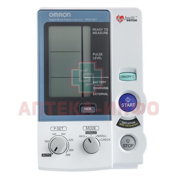 Измеритель артериального давления Omron, модель HEM-907, (или Омрон 907), модель HEM-907-E7, позволяет легко и с высокой степенью точности измерять артериальное давление пациента как в процедурном кабинете, так и непосредственно у постели больного. Тонометр Омрон 907 разрабатывался при участии врачей-кардиологов и предназначен для диагностики заболеваний в профессиональных медицинских учреждениях. Прибор учитывает все особенности проведения измерения давления и пульса. Методы измерения: осциллометрический и аускультативный.