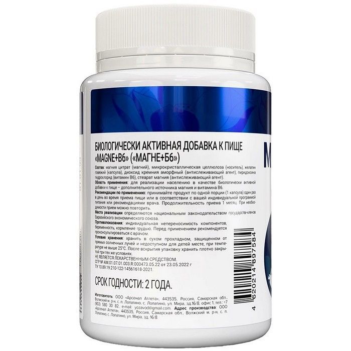 - магния цитрат (магний), микрокристаллическая целлюлоза (носитель), желатин говяжий (капсула), диоксид кремния (антислеживающий агент), пиридоксина гидрохлорид (витамин В6), стеарат магния (антислеживающий агент).