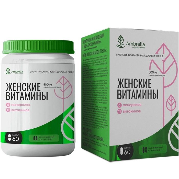 - AMBRELLA ЖЕНСКИЕ ВИТАМИНЫ - Биологически активная добавка (БАД) к пище - дополнительный источник холина, инозитола, минералов (магний, кальций, цинк, медь, йод, селен) и витаминов (С, В1, В2, В3, В6, Е, А, К1, пантотеновая кислота, фолиевая кислота, биотин, D3).
