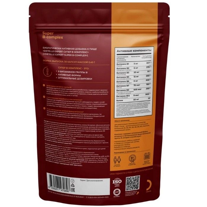 DIETELLE EXPERT СУПЕР В-КОМПЛЕКС - Биологически активная добавка (БАД) к пище состоит из 9 витаминов группы В в биодоступной форме и оптимальных дозировках.