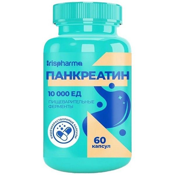 Панкреатин от бренда Irispharma это ферменты для пищеварения 10000 МЕ заключенные в кишечнорастворимую капсулу.