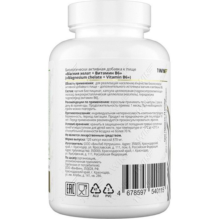 1WIN Магния хелат + В6 капс. №120 ВинЛаб Нутришин/Россия