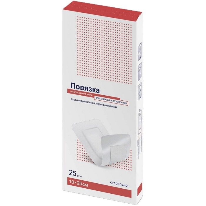 - Повязка пластырного типа, впитывающая, стерильная 10х25 см - 25 шт в уп.
