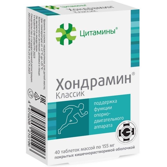- Хондрамин® Классик рекомендуется для поддержания нормального функционирования опорно-двигательного аппарата, способствует восстановлению хрящевой ткани.