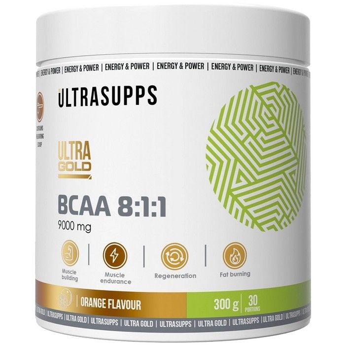 - Биологически активная добавка премиального качества Ultra Gold BCAA 8:1:1 от бренда ULTRASUPPS - 9 г быстроусваиваемых незаменимых аминокислот для ваших лучших спортивных результатов. В состав комплекса входят 3 незаменимых аминокислоты: L-лейцин, L-изолейцин и L-валин в соотношении 8:1:1 с увеличенным количеством L-лейцина для более активного роста мышц и быстрого восстановления между тренировками. ВСАА необходимы организму для активного синтеза мышечной ткани и предотвращения её разрушения. Специально проработанный состав добавки с повышенным в 4 раза количеством L-лейцина ускоряет процесс роста мышечных волокон.