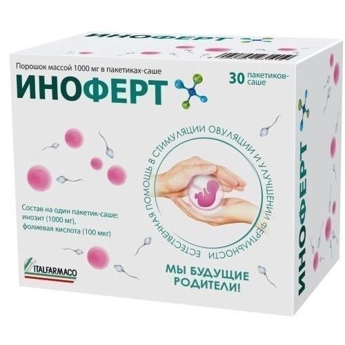 ИНОФЕРТ - естественная помощь в стимуляции овуляции и улучшении фертильности. Содержание в 1 пакетике-саше % рекомендуемого суточного потребления2 Инозит '1000 мг 200* Фолиевая кислота 100 мкг 50*1