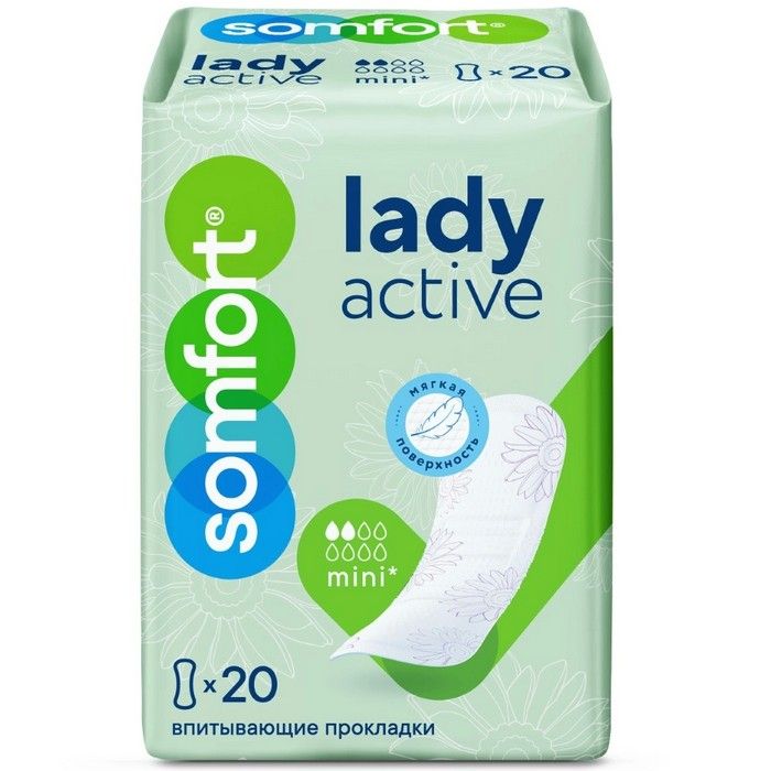 - Somfort Lady Active Mini (Сомфорт Леди Актив Мини) - надежные урологические прокладки, созданные для усиленного впитывания при легкой степени недержания. Благодаря гранулам суперабсорбента в составе впитывающего слоя быстро поглощают влагу, удерживая ее внутри прокладки, и нейтрализуют запах. Мягкие эластичные резиночки по бокам поддерживают форму прокладки и обеспечивают дополнительную защиту от протеканий. Мягкая поверхность дарит ощущение комфорта.