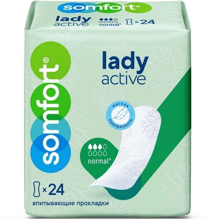- Somfort Lady Active Normal (Сомфорт Леди Актив Нормал) - надежные урологические прокладки, созданные для усиленного впитывания при легкой степени недержания. Благодаря гранулам суперабсорбента в составе впитывающего слоя быстро поглощают влагу, удерживая ее внутри прокладки, и нейтрализуют запах. Мягкие эластичные резиночки по бокам поддерживают форму прокладки и обеспечивают дополнительную защиту от протеканий. Мягкая поверхность дарит ощущение комфорта.