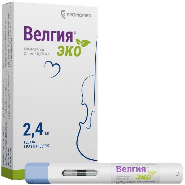 - Велгия® эко - это препарат, содержащий действующее вещество семаглутид, который назначается в качестве дополнения к низкокалорийной диете и физической активности для коррекции и контроля массы тела. Семаглутид относится к группе лекарственных средств: средства для лечения сахарного диабета; гипогликемические средства, кроме инсулинов. Семаглутид является аналогом природного гормона - глюкагоноподобного пептида-1 (ГПП-1), который выделяется после приема пищи и служит физиологическим регулятором углеводного обмена (уровня инсулина и глюкозы), а также аппетита и потребления пищи. Семаглутид воздействует на мишени (рецепторы) в головном мозге, которые