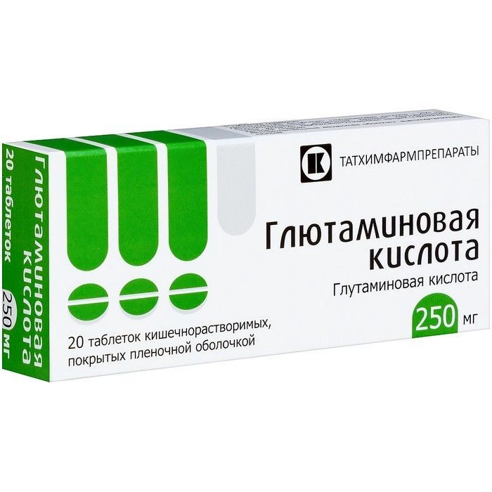- Действующее вещество: глутаминовая кислота – 250 мг.