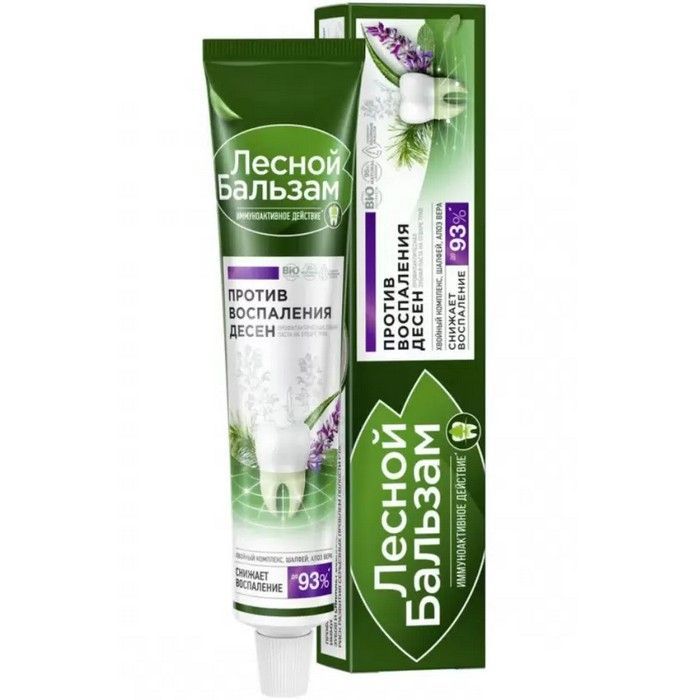 Бренд Лесной бальзам - это проверенные продукты, способствующие снижению воспаления, кровоточивости десен и обеспечивающие качественную профилактику основных проблем полости рта в домашних условиях.ЛЕСНОЙ БАЛЬЗАМ ЗУБНАЯ ПАСТА С ШАЛФЕЕМ ПРИ ВОСПАЛЕНИИ ДЕСЕН - специальная зубная паста, предназначенная для ухода за деснами при гингивите. В ее состав входит целый комплекс экстрактов трав, которые способствуют снятию воспаления, укрепляют и питают десны.Внешний вид и свойства: пастообразная текстура светло-зеленого цветаНовая зубная паста Лесной бальзам c иммуноактивным действием помогает решить проблему воспаления десен и в 2 раза улучшает работу собственного иммунитета полости рта, снижая риск развития проблем с деснами*.Клинически-доказанный эффект: