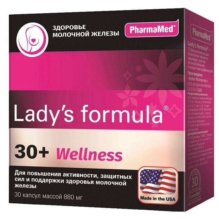 В чем особенность биокомплекса Lady's Formula® 30+™ Wellness?Lady's Formula® 30+™ Wellness - специальный биокомплекс, состоящий из 10 экстрактов лекарственных растений, 9 витаминов и минералов, - направлен на повышение защитных сил организма, энергии, улучшение обмена веществ и укрепление женского здоровья посредством сохранения гормонального баланса и нейтрализации вредных для женского организма специфических токсинов.Так, например, фитоэстрогены витекса снижают уровень пролактина, устраняя одну из причин мастопатии. Витекс рекомендуется также при эндометриозе, бесплодии, масталгии. Он стимулирует выработку дофамина - гормона «счастья или удовольствия», что благотворно влияет на нервную систему.Донг-квай регулирует баланс эстрогена и прогестерона, устраняя нарушения менструального цикла и симптомы ПМС. Он эффективен при бесплодии, эндометриозе, а при приеме оральных контрацептивов устраняет их побочные действия, в том числе набор веса. Донг-квай не имеет аналогов, так как современная медицина не может синтезировать действующие вещества этого растения.Энотера и спаржа - помимо содержащихся в них фитоэстрогенов, являются уникальными источниками омега-3, 6, 9 растительного происхождения. Кроме укрепления здоровья, они обладают выраженным косметологическим эффектом (повышают тургор кожи, сохраняют форму груди, улучшают состояние кожи, волос).Повышение иммунитета - другая сильная сторона биокомплекса 30+™ Wellness. Витамин Д3 и цинк в оптимальных дозировках повышают иммунитет, сопротивляемость организма к вирусным инфекциям (грипп и ОРВИ), а в сочетании с омега-3, 6, 9 и индол-3-карбинолом, мощным онкопротектором растительного происхождения, усиливают противоопухолевую защиту молочной железы.Сочетание магния с экстрактом корня сумы повышает уровень физической и сексуальной активности. Уникальные экстракты граната, китайского кудзу в сочетании с витаминами А, Е, кальцием, селеном усиливают выработку коллагена, повышают тургор кожи, сохраняют фигуру, форму и красоту груди, препятствуют набору лишнего веса.Здоровье и внешний вид женщины очень зависимы от гормонального фона, который чувствителен к стрессам, физическим и эмоциональным перегрузкам, диетам, приему гормональных контрацептивов. Биокомплекс Lady's formula® 30+™ Wellness мягко регулирует гормональный баланс без побочных действий, что делает безопасным его длительное применение.