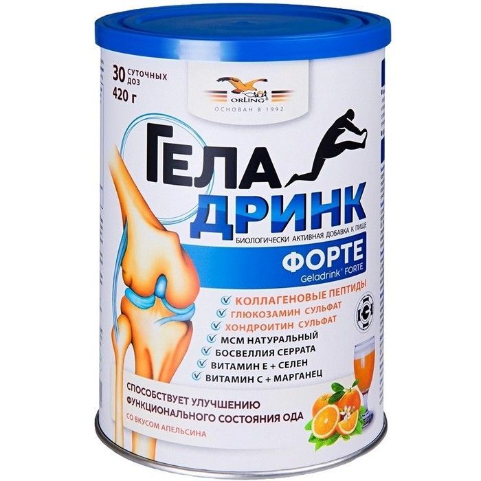 ГЕЛАДРИНК ФОРТЕ /АПЕЛЬСИН/ - Биологически активная добавка (БАД) к пище (30 суточных доз) - способствует улучшению функционального состояния опорно-двигательного аппаратаВнешний вид и свойства: Порошок оттенков молочно-жёлтого цвета со вкусом апельсина (иногда с более тёмными вкраплениями).Возраст: с 18+ лет