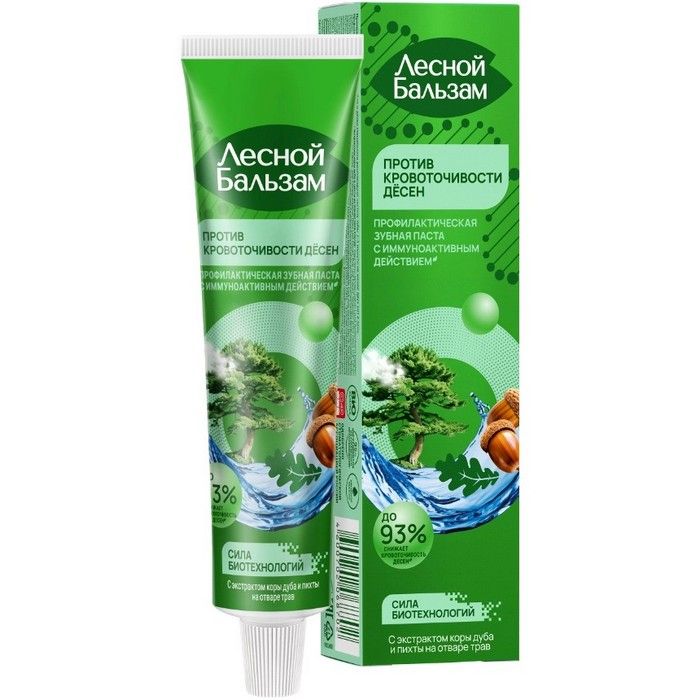 - Лесной Бальзам зубная паста на отваре трав с корой дуба при кровоточивости десен.