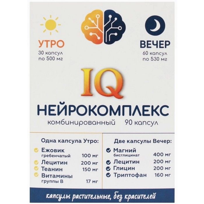 - НЕЙРОКОМПЛЕКС КОМБИНИРОВАННЫЙ IQ N30 КАПСУЛЫ УТРО ПО 500МГ+N60 КАПСУЛЫ ВЕЧЕР ПО 530МГ - Биологически активная добавка (БАД) к пище - Энергия днём, глубокое восстановление ночью