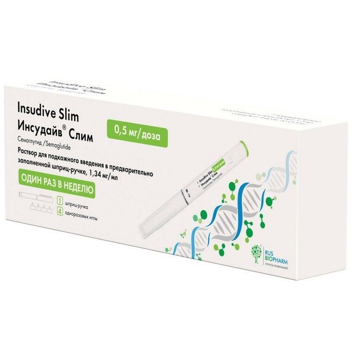 Инсудайв Слим® - это препарат, содержащий действующее вещество семаглутид, который назначается длякоррекции и контроля массы тела. Семаглутид относится к средствам для лечения сахарного диабета; гипогликемическим средствам, кроме инсулинов.Семаглутид является аналогом природного гормона - глюкагоноподобного пептида-1 (ГПП-1), которыйвыделяется после приема пищи и служит физиологическим регулятором углеводного обмена (уровня инсулина и глюкозы), а также аппетита и потребления пищи. Семаглутид воздействует на мишени (рецепторы) в головном мозге, которые контролируют аппетит, что помогает Вам быстрее почувствовать себя сытым, сохранить это ощущение надолго и снизить повышенную тягу к приему пищи.Также семаглутид затормаживает эвакуацию пищи из желудка, что дополнительно поддерживает длительное ощущение сытости. Такой механизм поможет Вам привыкнуть к правильному питанию и эффективно снизить массутела. При приеме семаглутида наблюдаются дополнительные эффекты, такие как уменьшение окружности талии, улучшение обмена веществ (уровня липидов, глюкозы и др.), улучшение параметров сердечно-сосудистой системы (артериальное давление, пульс).Снижение массы тела на фоне приема семаглутида способствует уменьшению риска развития осложнений, связанных с наличием повышенной массы тела, в частности, сердечно-сосудистых заболеваний, сахарного диабета 2 типа (СД2), репродуктивных нарушений, заболеваний суставов, печени и др.