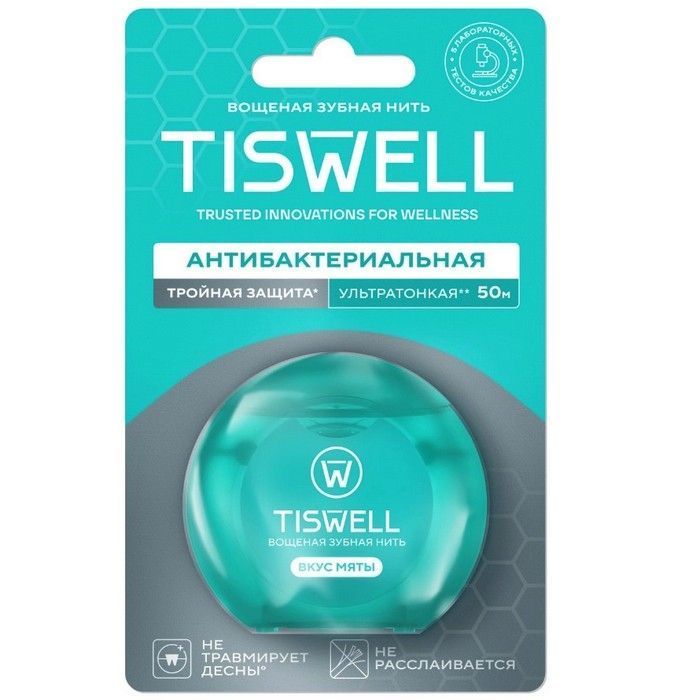 - Ультратонкая** вощеная нить Tiswell для защиты от кариеса подходит для чувствительных зубов.