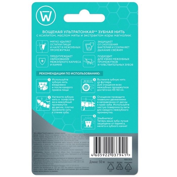 - Нить зубная ультратонкая** с тройной защитой* и мятным вкусом защищает от скопления бактерий и сохраняет дыхание свежим.