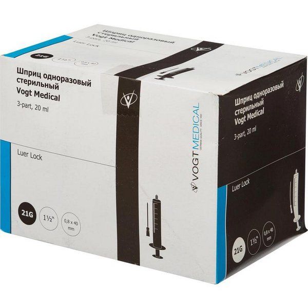 Шприц одноразовый с иглой 20мл (3-х комп.) 21G (игла 0,8х40) №1 Vogt Medical/Германия