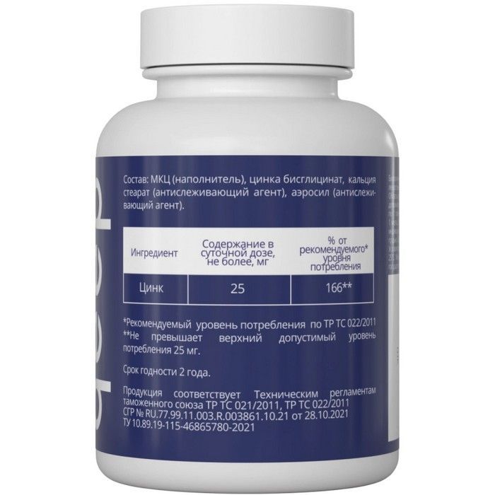 - цинка бисглицинат, МКЦ (наполнитель), кальция стеарат (антислеживающий агент), аэросил (антислеживающий агент).
