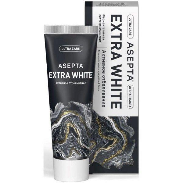 - Экстраотбеливающая черная гелевая зубная паста «ASEPTA» "Активное отбеливание" эффективно осветляет зубы, укрепляет и восстанавливает эмаль, придает улыбке блеск и сияние.
