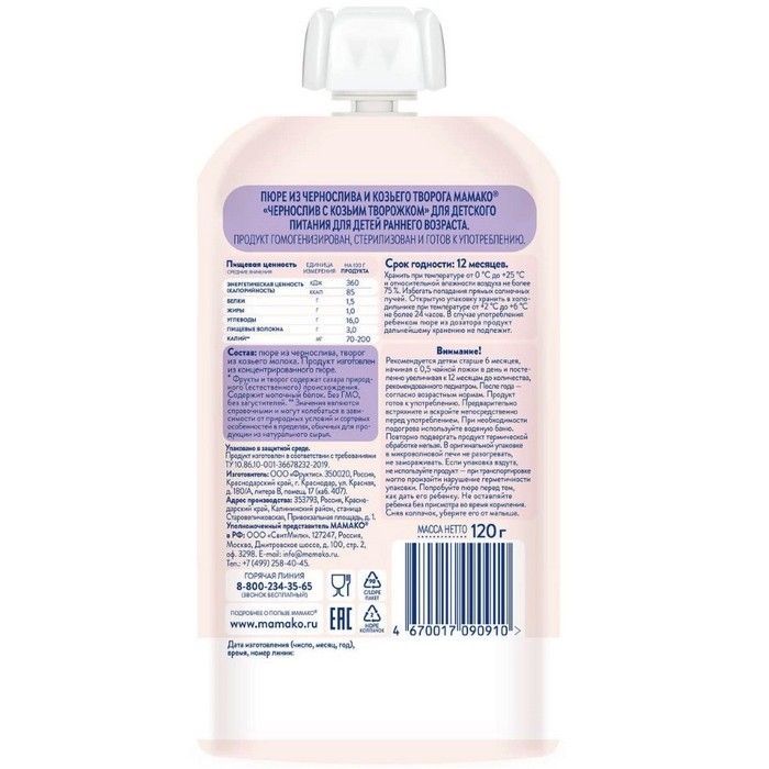 МАМАКО ПЮРЕ ЧЕРНОСЛИВ С КОЗЬИМ ТВОРОЖКОМ - для детского питания для детей раннего возраста. Продукт гомогенизирован, стерилизован и готов к употреблению. Возраст: для детей с 6 месяцев.