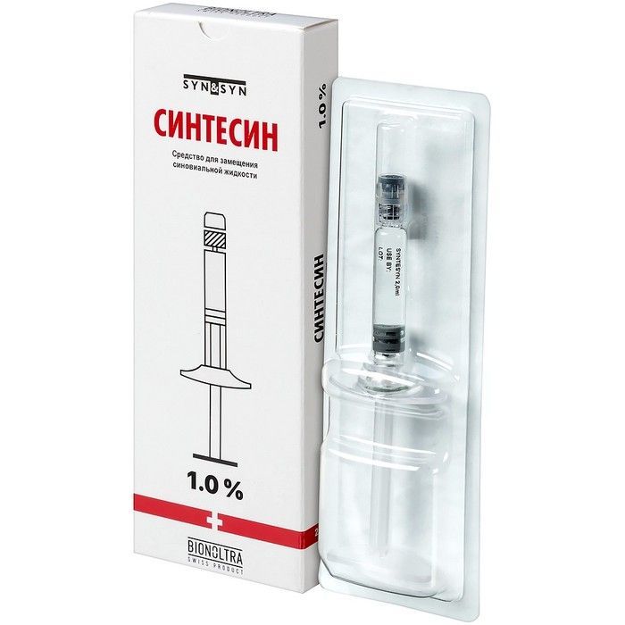 Механизм действияГиалуроновая кислота - необходимый компонент внеклеточного матрикса, присутствует в норме в высоких концентрациях в составе синовиальной жидкости и хряща. Гиалуроновая кислота обеспечивает вязкость и эластичность синовиальной жидкости, выполняя роль внутрисуставной смазки и предотвращая трение суставных поверхностей и их преждевременное изнашивание. В составе синовиальной жидкости выступает дополнительным амортизатором (смягчает внешние удары, защищая компоненты сустава от повреждения). Также гиалуроновая кислота необходима для формирования хряща через обновление его состава. При остеоартрозе отмечаются дефицит и качественные изменения гиалуроновой кислоты в составе синовиальной жидкости и хряща.Эффективность изделия обусловлена его биосовместимостью и физико-химическими свойствами. Механизм действия изделия основан на восстановлении вязкости синовиальной жидкости и хондропротективном действии на гиалиновый хрящ в суставах, поражённых остеоартрозом, что приводит к улучшению функционального состояния сустава. Изделие восполняет дефицит природного гиалуронана, содержащегося в синовиальной жидкости, гиалиновом хряще и других внутрисуставных структурах и утраченного в результате дегенеративных или травматических изменений тканей сустава. В результате воздействия купируется болевой синдром и улучшается подвижность сустава.Изделие распределяется местно в полости сустава, где оно подвергается локальным преобразованиям. На основании клинических сведений об особенностях биодеградации и продолжительности эффектов внутрисуставного введения гиалуроновой кислоты предполагается, что биодеградация для каждого варианта исполнения СИНТЕСИН в организме происходит в срок от 12 до 24 недель. Скорость биодеградации зависит от состояния и особенностей метаболизма конкретного пациента. Клинический эффект сохраняется не менее 6 месяцев. Продукты деградации изделия могут быть использованы тканями в процессах повторного эндогенного синтеза гиалуронана. Выводится через гломерулярный фильтр, не повреждая почечную ткань.