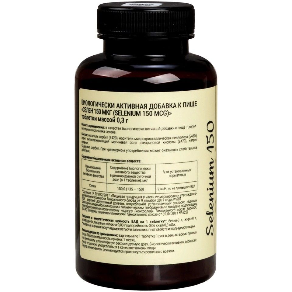 Содержание биологически активного вещества в рекомендуемой суточной дозе (в 1 таблетке):Селен 150,0 (135 – 150) 214,3*% от установленных нормативов, но не превышает ВДУ*- согласно ТР ТС 022/2011 «Пищевая продукция в части ее маркировки», утвержденному Решением Комиссии Таможенного союза от 9 декабря 2011 года № 881ВДУ - верхний допустимый уровень потребления, установленный согласно «Единым санитарно-эпидемиологическим и гигиеническим требованиям к товарам, подлежащим санитарно-эпидемиологическому надзору (контролю)» Таможенного союза ЕврАзЭС (ЕАЭС) (введены решением Комиссии Таможенного союза от 07.04.2011 № 622)