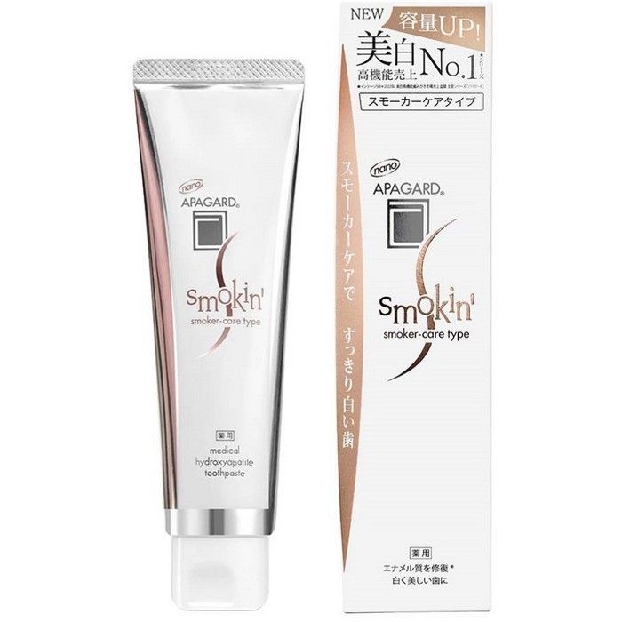 - ОТБЕЛИВАЮЩАЯ ЗУБНАЯ ПАСТА APAGARD SMOKIN- содержит инновационный запатентованный компонент от японских ученых SANGI - Медицинский Нано-Гидроксиапатит (NANO™), идентичный гидроксиапатиту, который входит в состав костей и зубов, и составляет 96% от эмали зуба.
