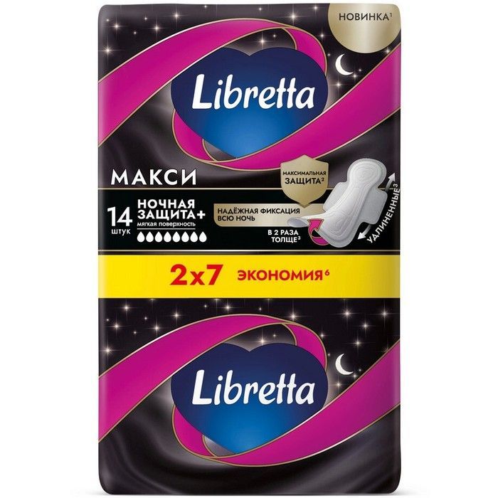 LIBRETTA ПРОКЛАДКИ МАКСИ НОЧНАЯ ЗАЩИТА+ С МЯГКОЙ ПОВЕРХНОСТЬЮ - для очень интенсивных выделений.