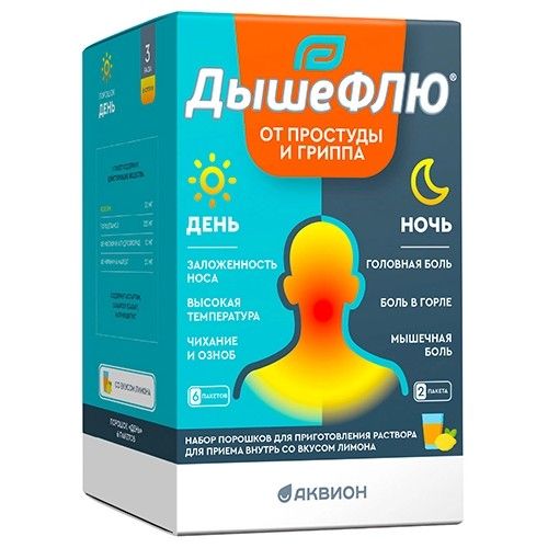 - В дневное время суток по 1 пакету препарата ДышеФЛЮ®, порошок «День» через каждые 4–6 часов, по мере необходимости, но не более 3-х раз в сутки.