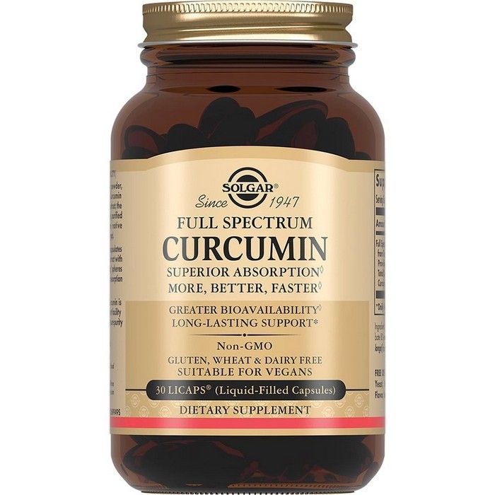 Бренд Solgar (Солгар) - всемирно известный производитель высокоэффективных натуральных препаратов для здоровья. Капсулы «Куркумин» (Full Spectrum Curcumin Capsules) - сбалансированный составНатуральное сырье корня куркумы (Куркума длинная). В 185 раз больше степень биодоступности по сравнению с порошком Куркумы. В 6,8 раз выше скорость всасывания по сравнению с порошком Куркумы. Все это благодаря использованию инновационной технологии NovaSOL®, которая позволяет перевести жирорастворимое вещество в водорастворимые легкоусвояемые мицеллы. Мицеллы малого размера (30 нм) устойчивы в кислой среде желудка. Мощный антиоксидант, снижает воспаление, обеспечивает поддержку иммунной системы. Куркумин благоприятно влияет на работу всего организма, в том числе способствует здоровой работе суставов, улучшению их подвижности и гибкости, а также снижению скованности мышц и лучшему их восстановлению при физических нагрузках. Помогает защитить сердце, оказывая положительное влияние на функцию сердечно-сосудистой стенки. Способствует стимулированию иммунитета, повышая сопротивляемость организма к инфекциям. Не содержит глютена, пшеницы, молочных продуктов, без ГМОБез консервантов. Подходит для вегетарианцев. без красителейбез отдушекРекомендуемый прием (1 капс. ) содержит:куркумин - 40 мг.