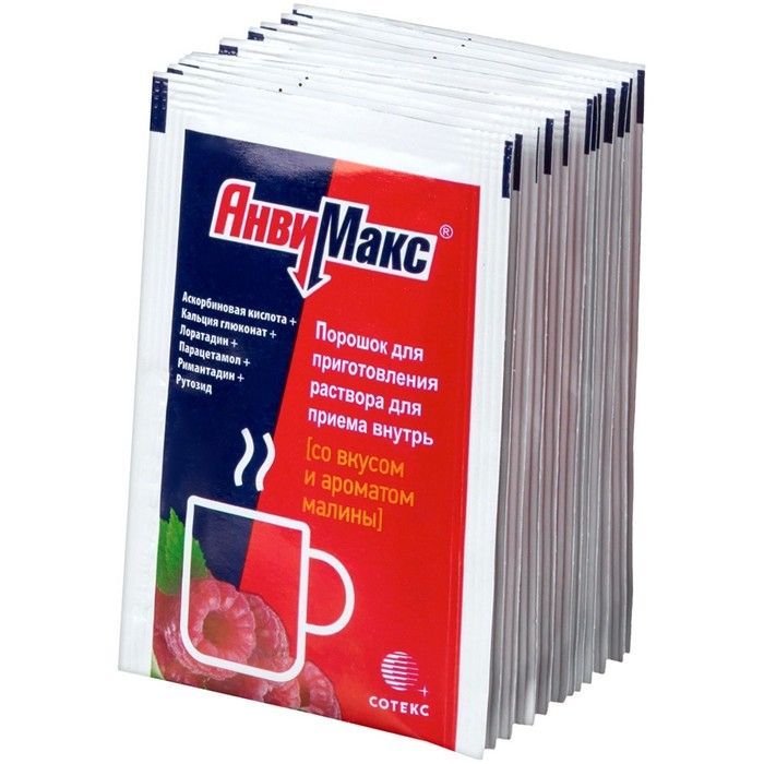 - Каждый пакетик (5 г) содержит: 360 мг парацетамола, 300 мг аскорбиновой кислоты, 100 мг кальция глюконата моногидрата, 50 мг римантадина гидрохлорида, 20 мг рутозида тригидрата (в пересчете на рутозид), 3 мг лоратадина.