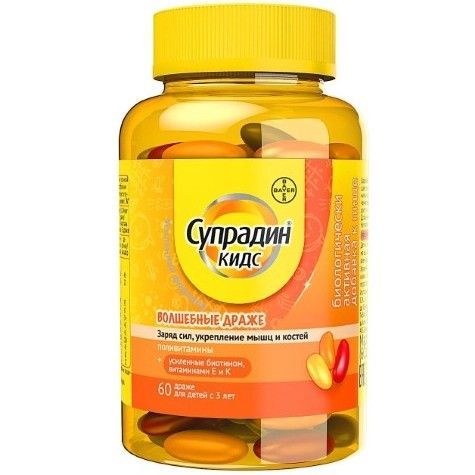 - Супрадин Кидс Волшебные драже повышает выносливость за счет усиленного содержания биотина, Витаминов Е и К, которые укрепляют мышцы и кости ребенка.