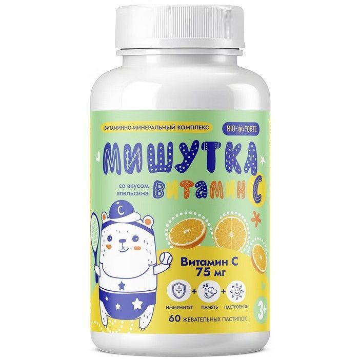 Мишутка BioForte с витамином C помогает поддерживать иммунную систему и общее здоровье. Витамин C, или аскорбиновая кислота, является важным водорастворимым витамином, который играет ключевую роль в различных физиологических процессах.