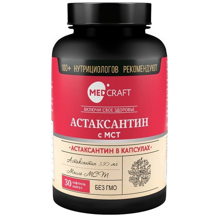 Medcraft астаксантин с мст(medium-chain triglycerides) - это самый знаменитый природный антиоксидант в мире. Его источник - микроводоросли haematococcus pluvialis.