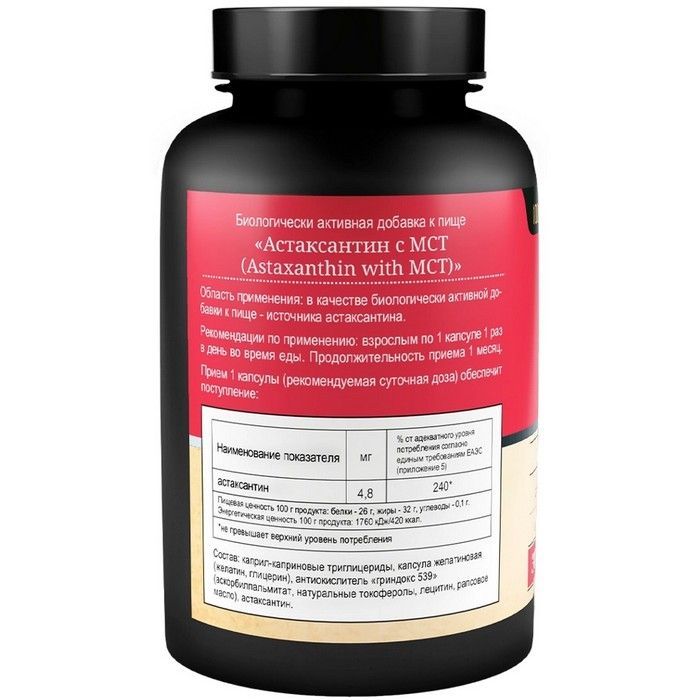 - улучшает микроциркуляцию сосудов, работает как витамины для зрения. Еще одно свойство - это защита кожи и суставов, а также ANTI-AGE эффект. Он проникает в глубокие слои эпидермиса, защищая кожу от воздействия свободных радикалов - молекул, которые разрушают клетки кожи и приводят к преждевременному старению. Он также повышает эластичность кожи и способствует сохранению влаги, защищает от УФ-лучей. В комплексе астаксантин капсулы работают вместе с МСТ маслом (medium-chain triglycerides), которое является хорошим проводником и усилителем биодоступности природного антиоксиданта.