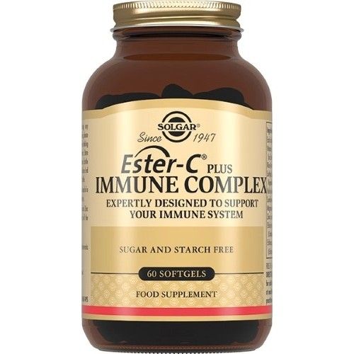 «Иммуно-комплекс Эстер С плюс» (Ester-C Plus Immune Complex Softgels) Пищевая ценность (1 капс.): жиры - 0,6 г. Энергетическая ценность (1 капс.): 5 ккал/21 кДж Рекомендуемый прием (1 капс.) содержит: цинк - 7,5 мг, витамин С - 500 мг, витамин А - 375 мкг, витамин D3 - 7,5 мкг, пантотеновой кислоты - 5 мг, витамин В6 - 1 мг, биотина - 150 мкг, фолиевой кислоты - 200 мкг, витамин В12 - 3 мкг, что составляет 50%, 833%, 47%, 150%, 83%, 50%, 300%, 100%, 300% от рекомендуемого уровня суточного потребления.
