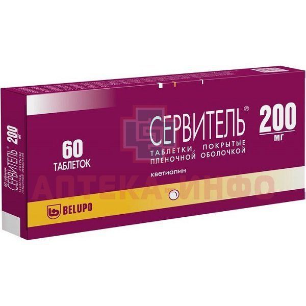 - Кветиапин является атипичным антипсихотическим средством. Кветиапин и его активный метаболит в плазме человека N-дезалкилкветиапин (норкветиапин) взаимодействуют с широким спектром нейтротрансмиттерных рецепторов головного мозга. Кветиапин и N-дезалкилкветиапин проявляют высокое сродство к 5НТ2-серотониновым рецепторам и D1- и D2-дофаминовым рецепторам головного мозга. Антагонизм к указанным рецепторам в сочетании с более высокой селективностью к 5НТ2-серотониновым рецепторам, чем к D2-дофаминовым рецепторам, обуславливает клинические антипсихотические свойства кветиапина и низкую частоту развития экстрапирамидных нежелательных реакций (НР). Кветиапин не обладает сродством к переносчику норадреналина и обладает низким сродством к 5НТ1A-серотониновому рецептору, в то время как N-дезалкилкветиапин проявляет высокое сродство к обоим. Ингибирование переносчика норадреналина и частичный агонизм в отношении 5НТ1A-серотониновых рецепторов, проявляемые N-дезалкилкветиапином, могут обуславливать антидепрессивное действие препарата Сервитель®. Кветиапин и N-дезалкилкветиапин обладают высоким сродством к гистаминовым и α1-адренорецепторам и умеренным сродством по отношению к α2-адренорецепторам. Кроме того, кветиапин не обладает или обладает низким сродством к мускариновым рецепторам, в то время как N-дезалкилкветиапин проявляет умеренное или высокое сродство к нескольким подтипам мускариновых рецепторов.