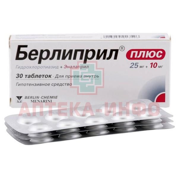 - препарат Берлиприл Плюс 10/25 обладает антигипертензивным и диуретическим действием. Эналаприл и гидрохлоротиазид применяют для лечения при АГ отдельно и в комбинации — в последнем случае их антигипертензивные эффекты суммируются. Эналаприл снижает потерю калия, вызванную гидрохлоротиазидом.