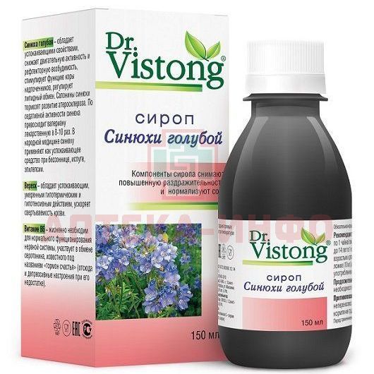 Сироп Синюхи голубой серии Dr.Vistongэто растительный комплекс на основе успокаивающих трав, которые способствуют снижению нервного напряжения, раздражительности и тревоги. Компоненты сиропа помогают в случаях бессонницы, плохого настроения, подавленного общего состояния, повышенной раздражительности и беспокойства, головных болей, вызванных нервными напряжениями.Показания